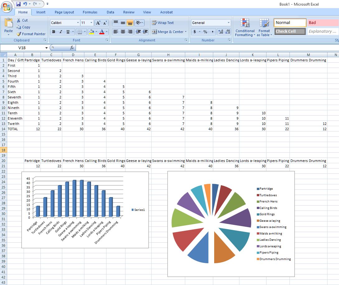 I created a spreadsheet (as you do!) of the gift-giving – and found that the Partridge in a pear tree, and the 12 drummers drumming, are actually the LEAST numerous gifts – at a total of just 12 each (12 days x 1 partridge, and 1 day x 12 drummers).