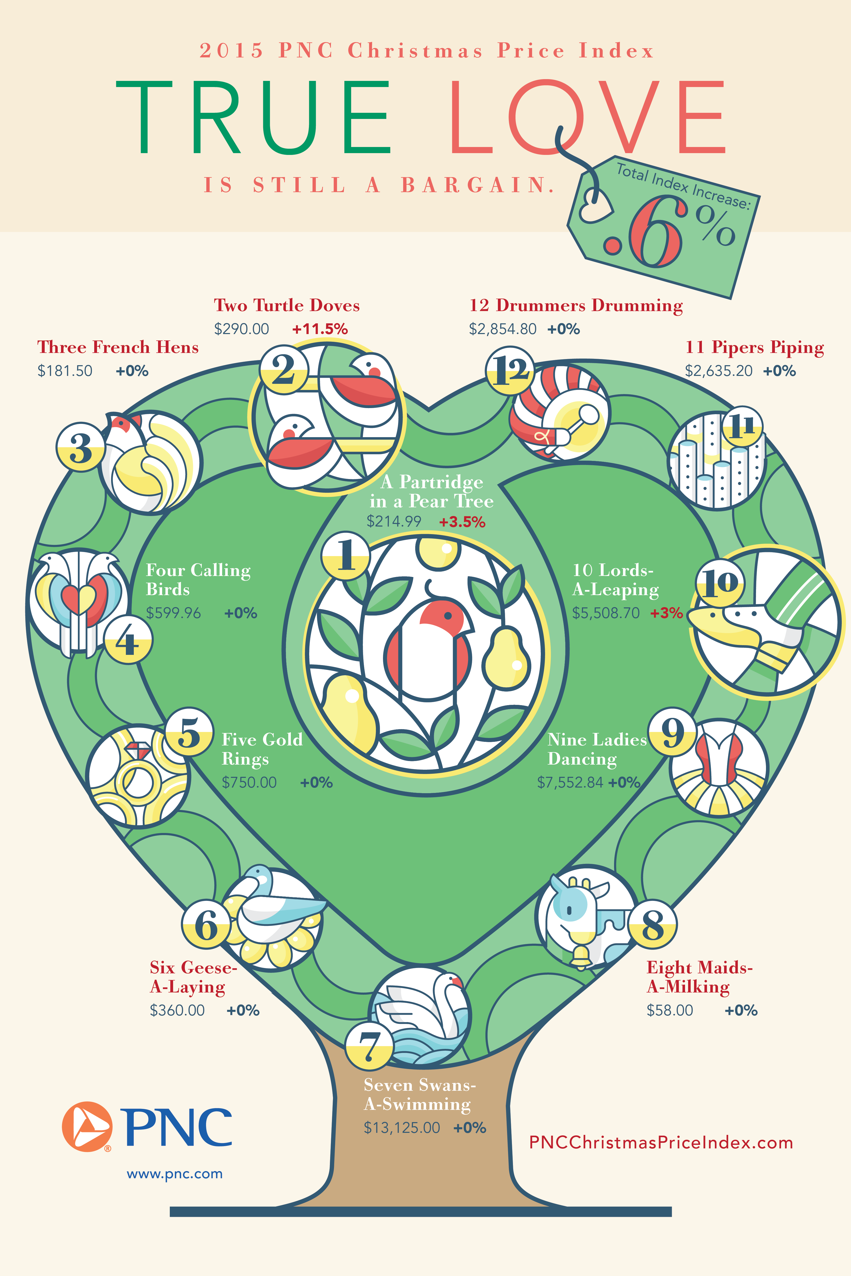 According to PNC, the financial group responsible for the figures, the most expensive gifts are the swans (at $1875/swan, or $13,125 per gift, for a total of nearly $80,000 if you give the gift of seven swans 6 times!)