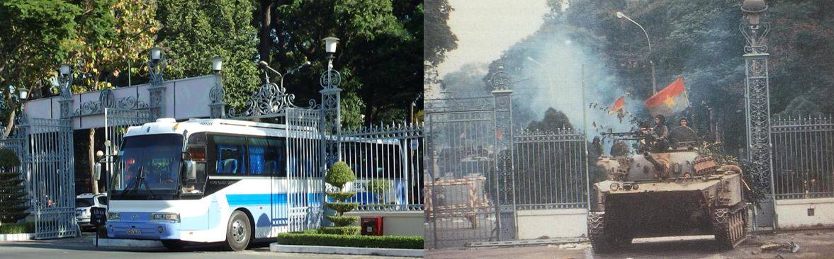 What a difference 40 years makes. A modern tourist bus rolling through the same gates that North Vietnamese tanks had smashed down in 1975