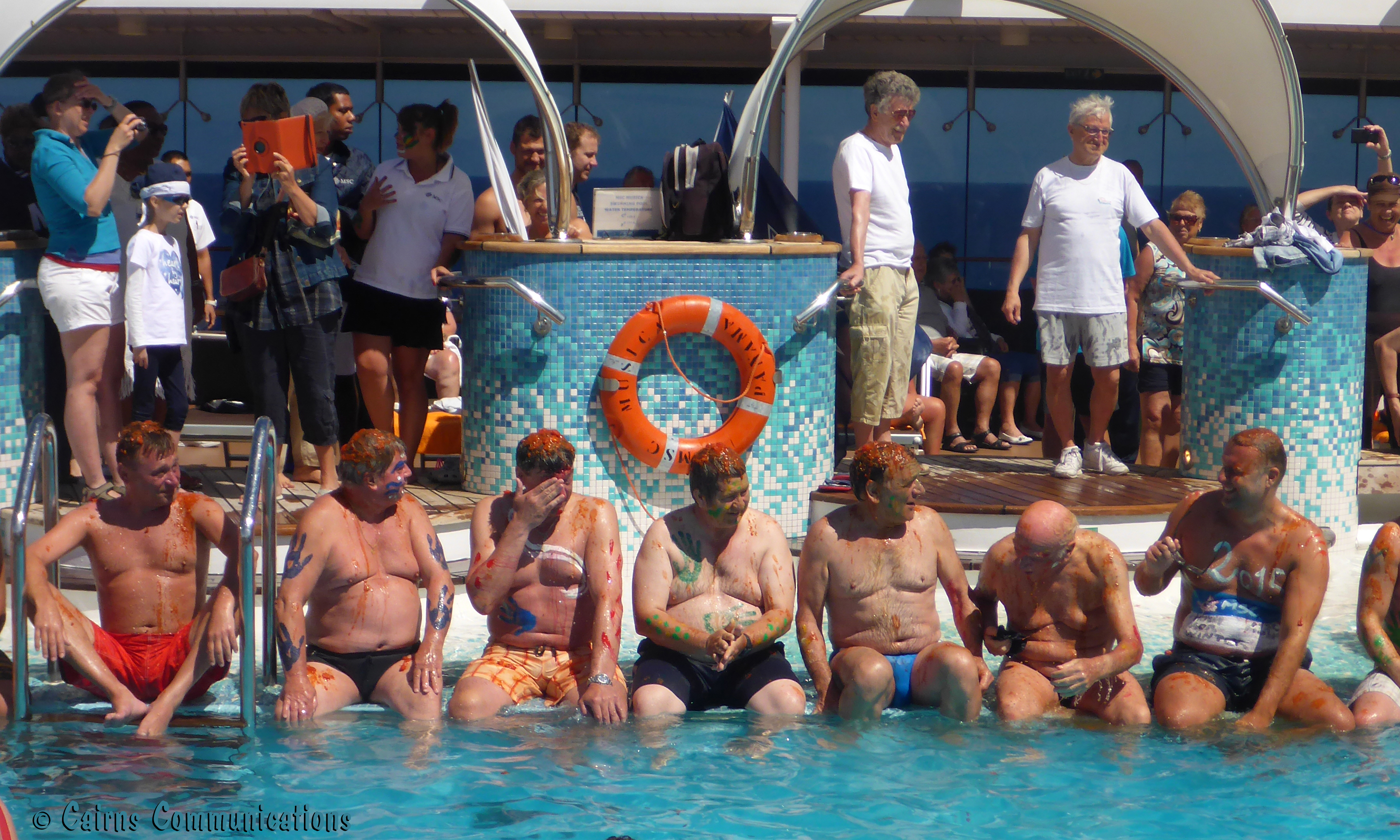 The voyage involved six straight sea-days crossing the Atlantic and on day three we had this ceremony – which involved kissing a large fish held by a passenger in a mermaid costume, doing a dance around the pool deck covered in water-colour paints, and having a variety of foodstuffs smeared over our heads – including spaghetti sauce, cocoa, and flour paste.