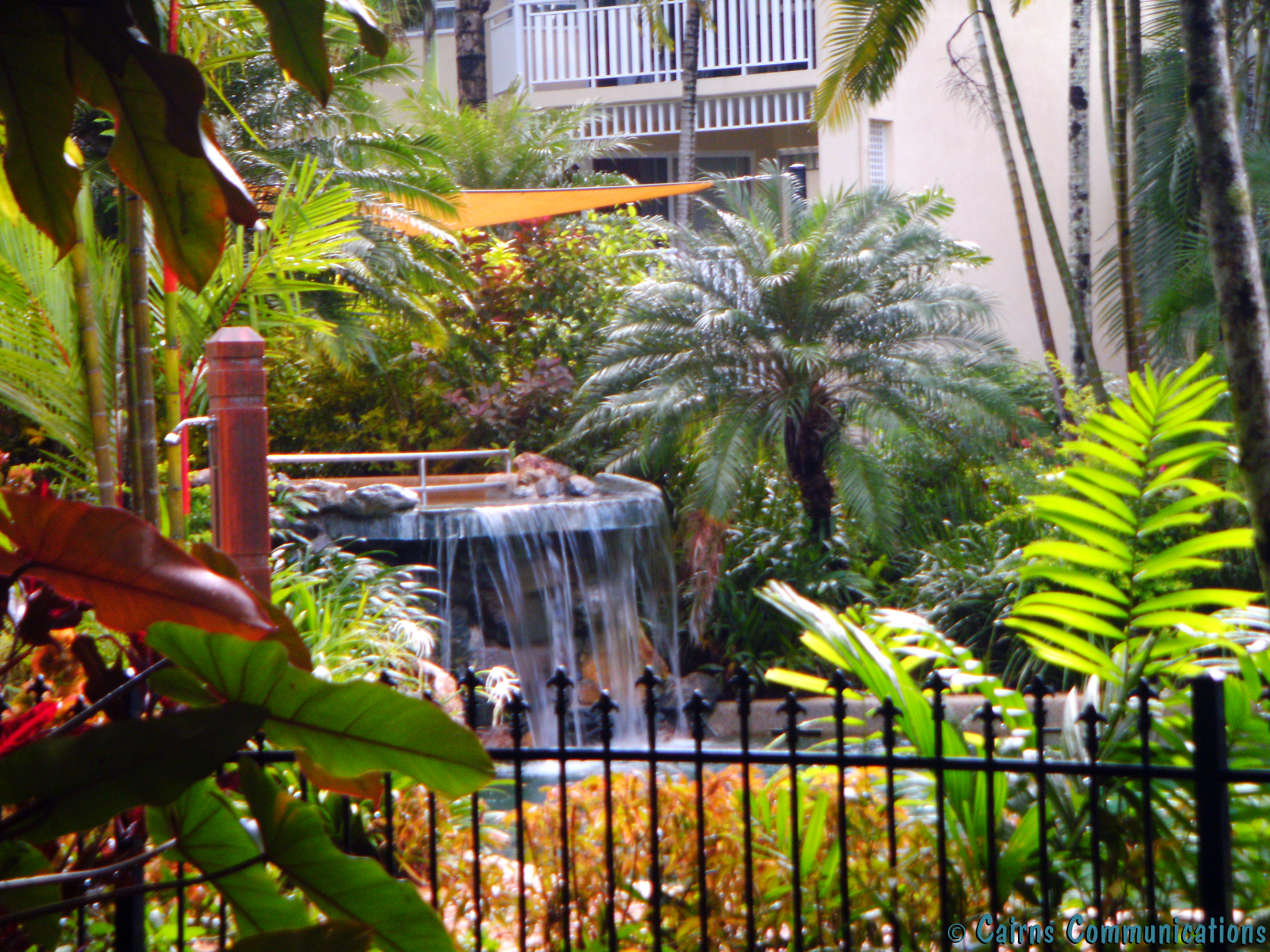 This image was from the verandah of one ground-floor unit we stayed at – with tropical gardens, a splashing waterfall, and a gorgeous swimming pool just metres from our door.