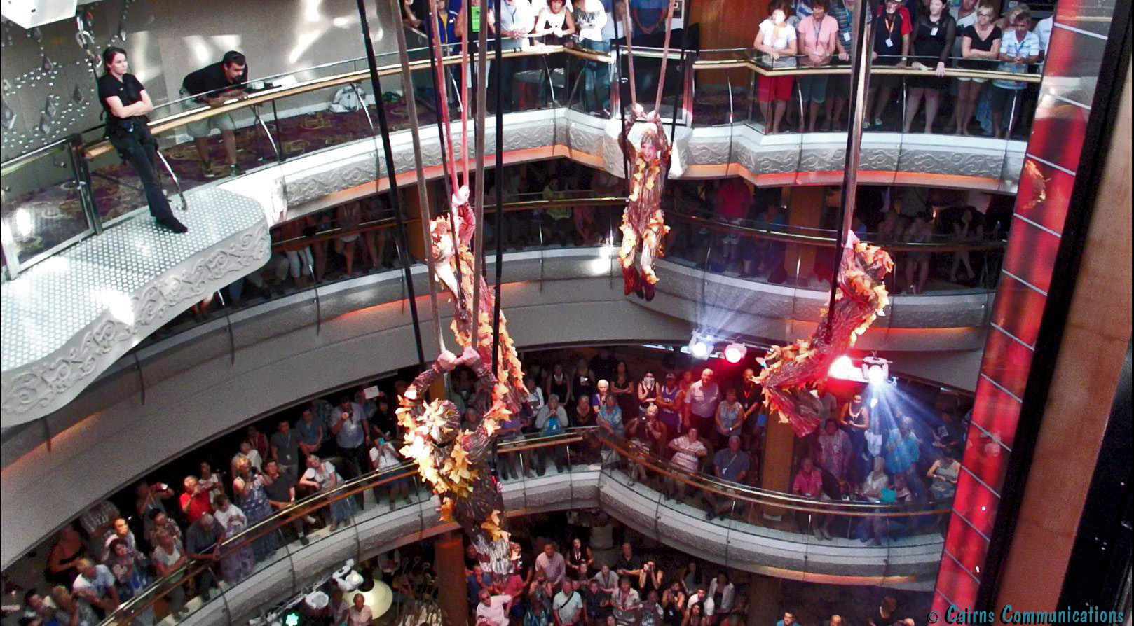 When we sailed on the Legend of the Seas early in 2016, our cabin was near the central atrium – which they called the Centrum – and as we passed, we often saw aerial performers practising for a show which involves a cross between rhythmic gymnastics and bungee jumping – all in a six-story space in the centre of a moving cruise ship.