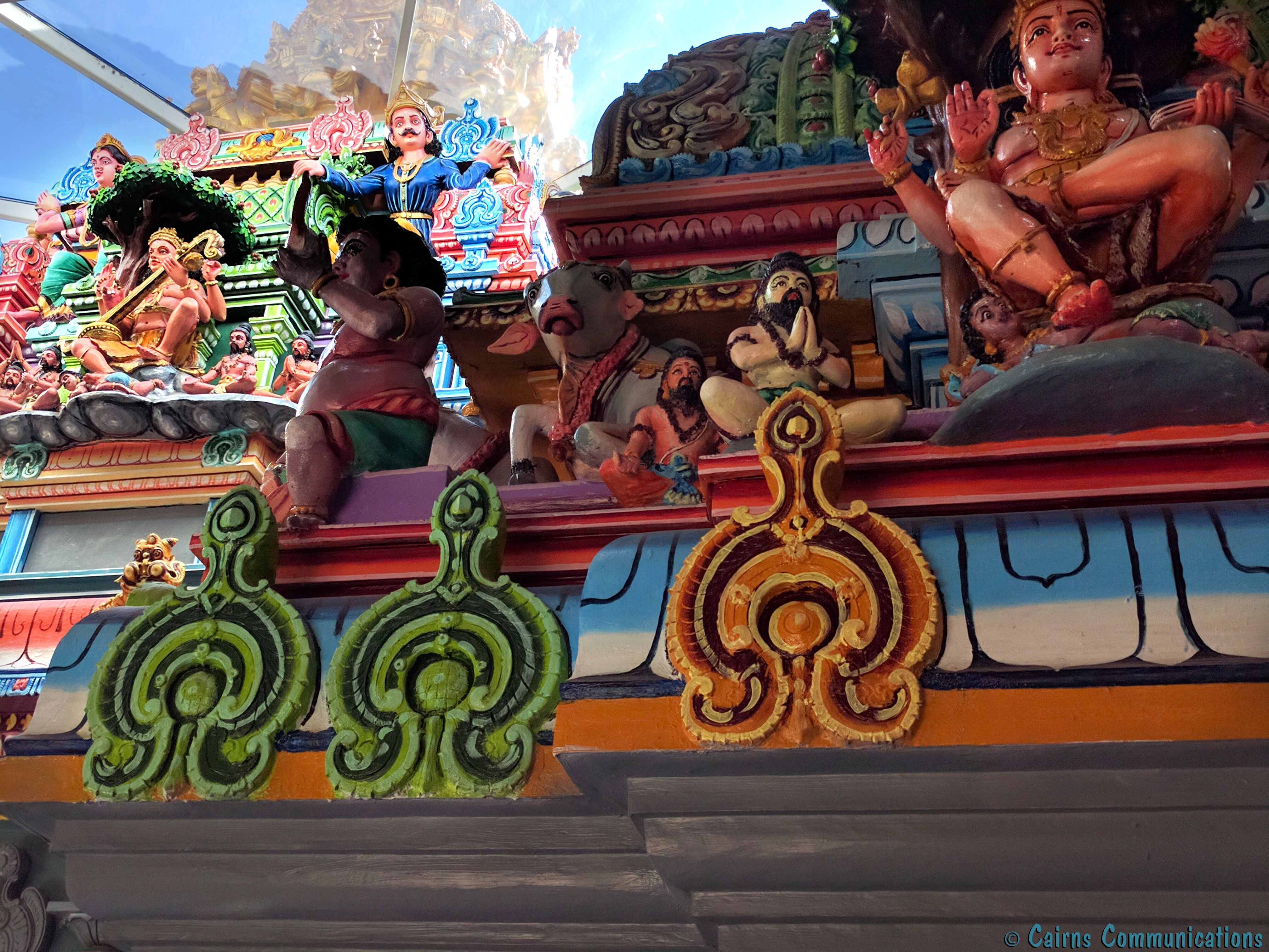 And in today’s #travelpic, there’s an interesting juxtaposition between the colourful carvings of characters from the Vedas, the glass ceiling of the temple, and the azure skies of a South East Queensland spring.