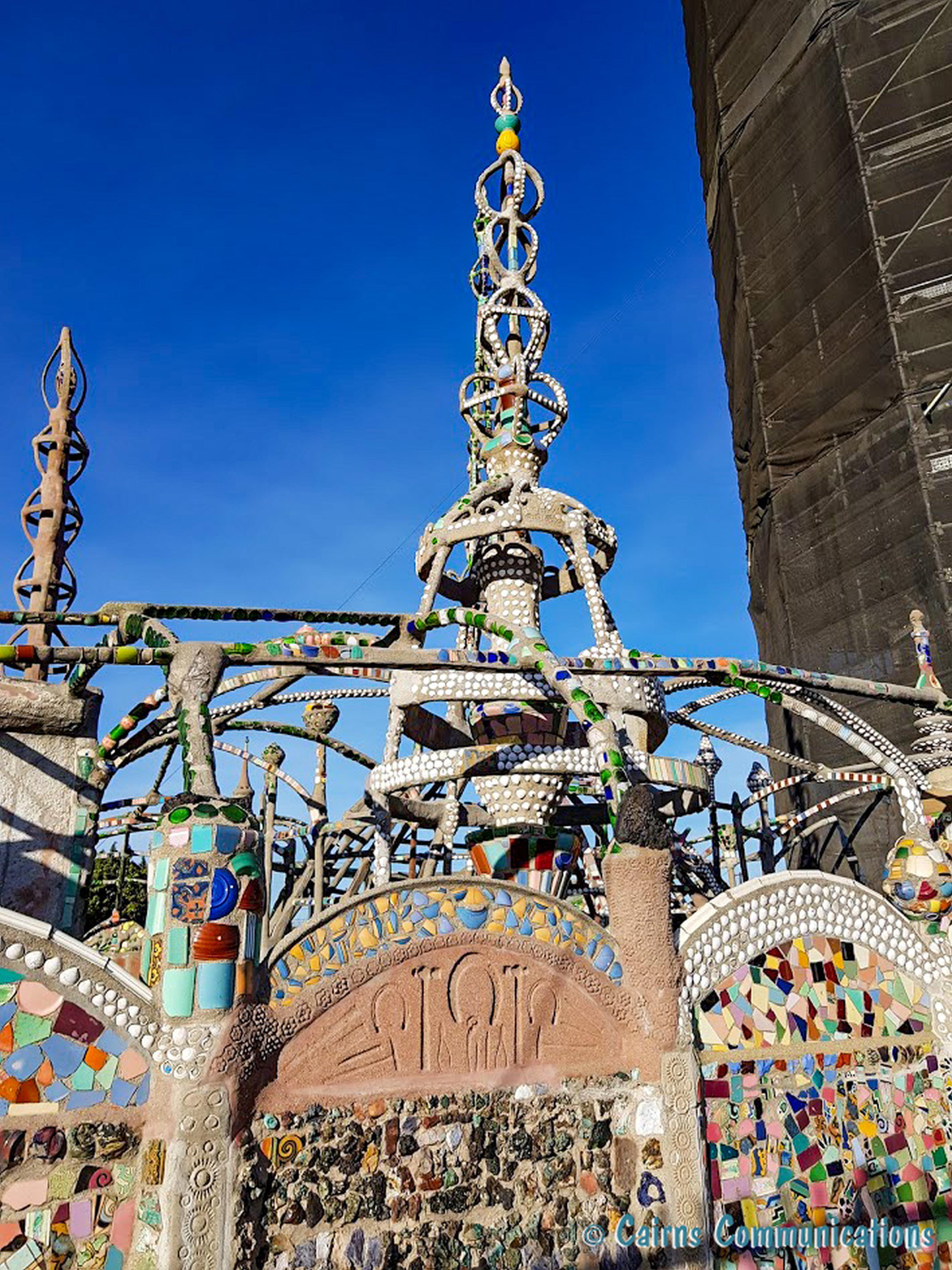 Rodia built towers made from scrap steel woven together with wire, then coated in concrete and decorated with bits of pottery, shards of ceramics, broken shells, broken bottles, rocks and pebbles, and other cast-off building materials from up to 25km away.