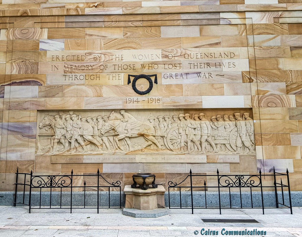 Directly below the Shrine is a wall that contains a World War I memorial sculpture. The wall is dedicated to the 60,000 Queenslanders who fought in World War I – the war that was supposed to end all wars.