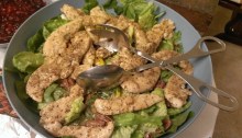 The theme for our travel pics this week is E, for Eating. One of the best parts about taking photos while travelling is that looking at them later helps bring back the memories. This particular dish is one of my favourites – Honey Mustard Chicken Salad, with pecans, leafy greens, onion, and capsicum (peppers…