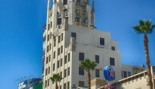 Maybe it’s just me, but I seem to see microcosms of our world whenever I put the camera’s viewfinder to my eye. Here’s a perfect example. We were walking along Hollywood Boulevard in Los Angeles recently, when this building caught my eye. Not the bright, garish Wax Museum – but the abandoned Art Deco structure…